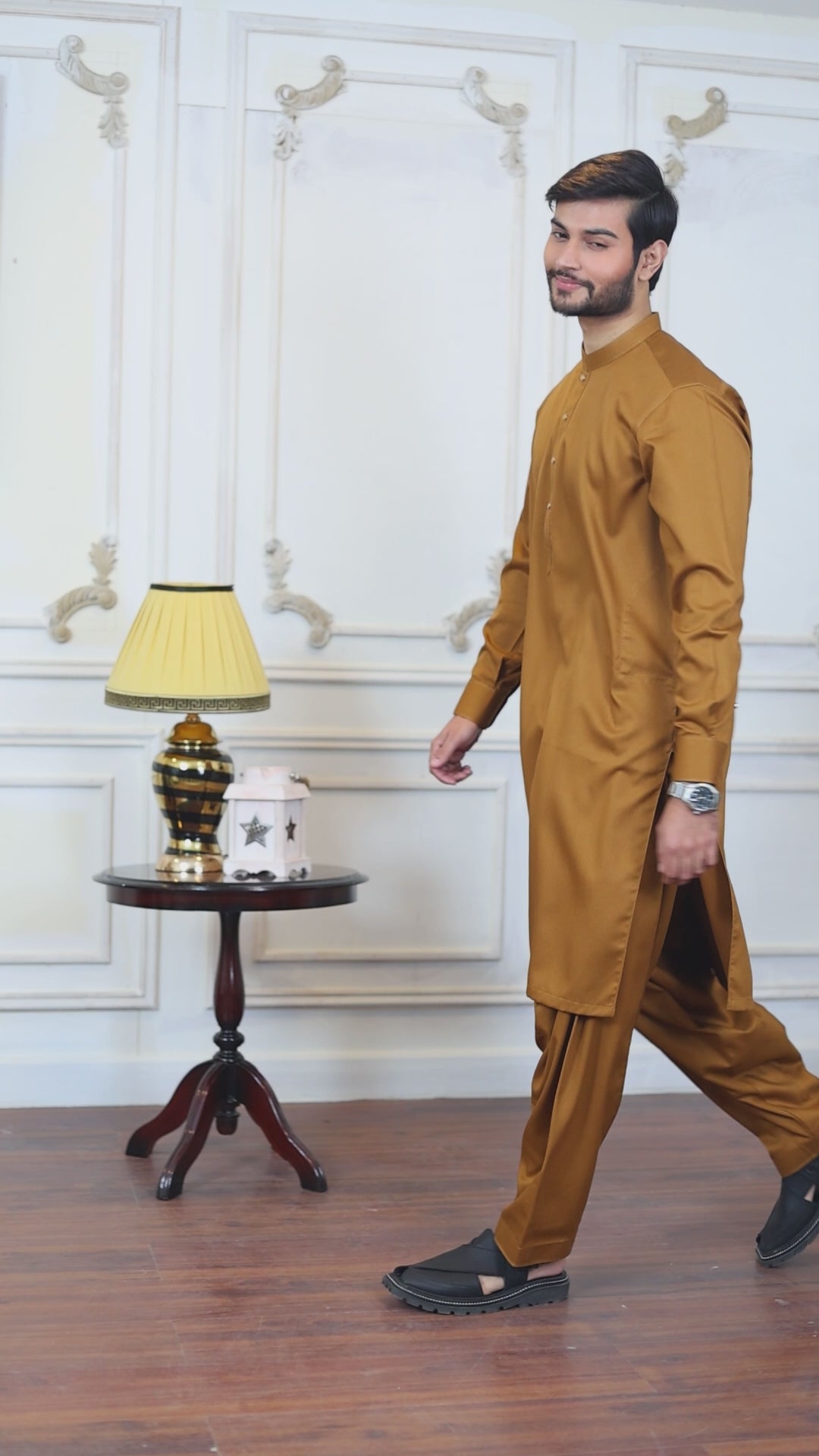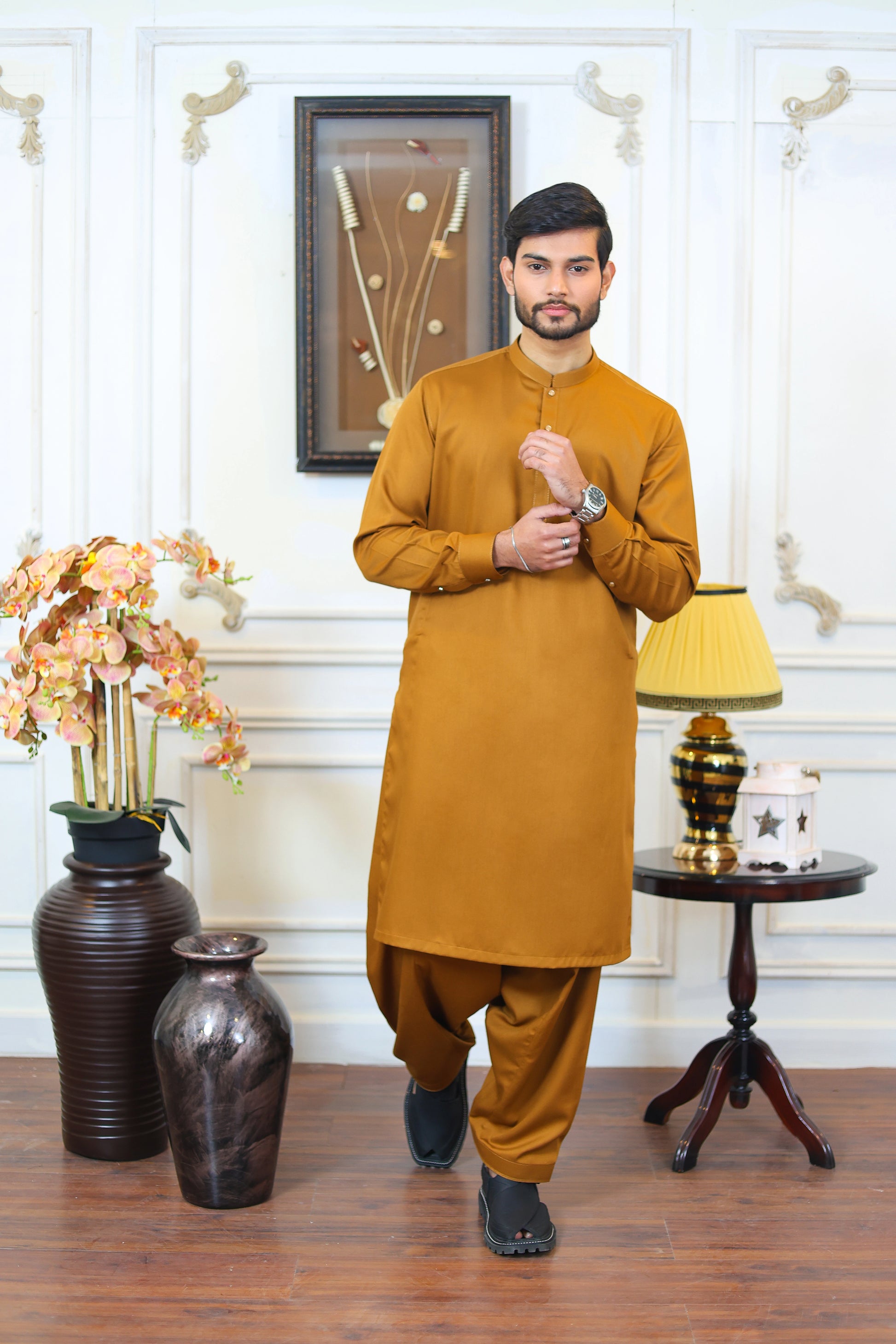 Step into sophistication with Zulaar's Executive Wash and Wear Kameez Shalwar in a stunning Shining Gold hue. Designed for the modern gentleman, this ensemble blends effortless style with unmatched comfort, making it a perfect choice for any occasion.